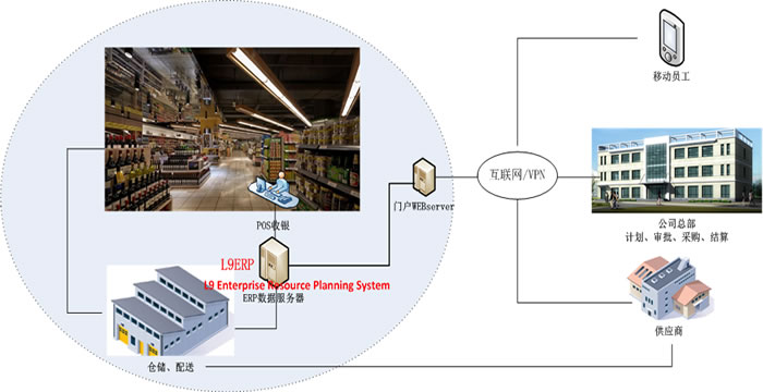 三、应用方案说明 1、在公司建立统一的数据中心,部署L9数据服务器。后端实现采购、仓储、财务结算管理系统。采购实现采购计划、采购补库计划、采购发票、付款申请、采购结算;仓储实现采购入库、调拨出库、其他出入库、盘点、报废、批次管理、保质期管理、动态存量管理、安全预警、补库预警等;财务结算管理应收应付账款、财务结算、成本费用、毛利核算等。 2、在前端门店/超市部署L9-POS收银管理系统。包括,价格政策(销售价格政策、绑赠促销政策、价格促销政策、换购促销政策、会员积分政策、商品稽查)、POS前台收银系统(销售扫码、会员卡、会员积分、购物卡、代金卷、提货卷结算、多卡结算、结算挂起、货品折扣、整单折扣)、店面盘点、数据下载、数据上传、交班管理、销售明细表、销货统计表、账户收支明细表。 3、上级机构和远程移动员工,通过移动终端远程接入,实现对物流、商超业务的审批、监督、查询分析。 |