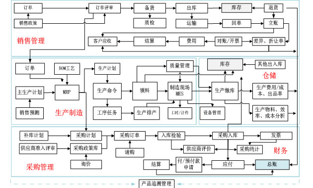 在原辅料供应、生产管理、仓储物流、营销相关业务环节采取合适的软硬件技术手段实时记录产品信息,可通过查询随时跟踪产品的生产状态、仓储状态和流向,以达到产品追溯管理目的的规定。