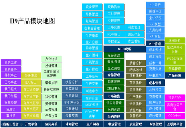 H9涵盖企业协同管理、计划管理、销售管理、采购管理、仓储管理、生产管理、MES、质量管理、成本管理、财务结算管理、KPI管理、产品追溯管理、自定义二次开发平台等管理领域。