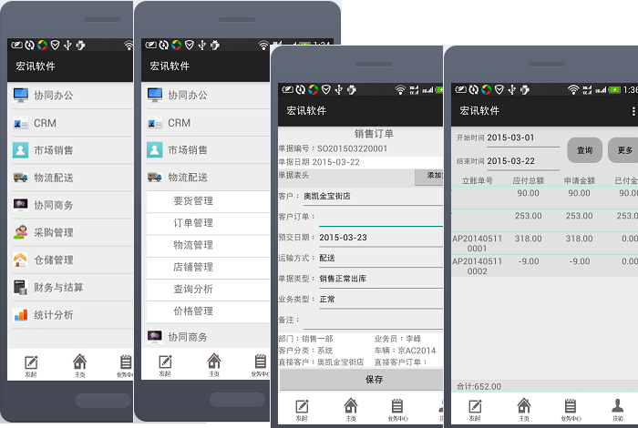 宏讯HMC移动商务系统基于 Android系统平台,涵盖协同办公、CRM、售后服务、物流配送、市场销售、采购管理、仓储管理、电子商务、管理订阅、预警中心、审批管理、企业社区、协同商务(客户供应商协同)、财务及结算、管理查询及分析等功能,为客户提供随时、随地、随需的商务应用和管理协同。